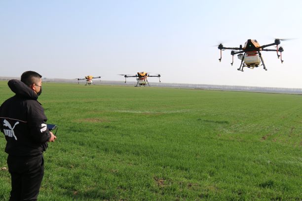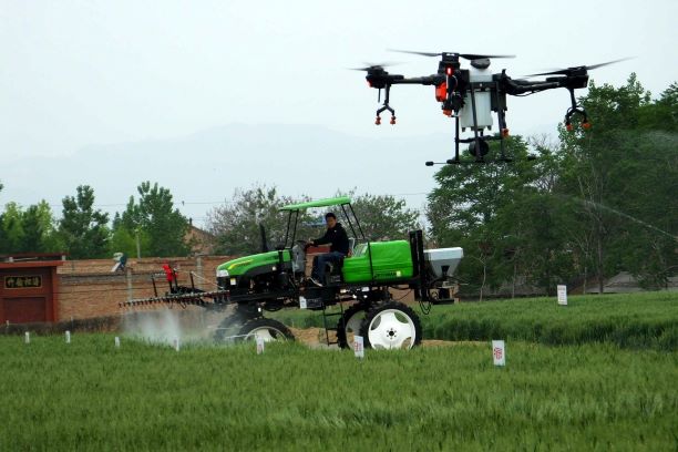 2019年5月6日,山西运城市新绛县珍粮粮食种植专业合作社在使用无人机和专用农机同步对3000亩冬小麦实施智能化“一喷三防”作业。