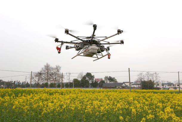 2014年3月11日,四川安县黄土镇盐井村田野上空正在给油菜喷洒农药的农用智能无人植保机。
