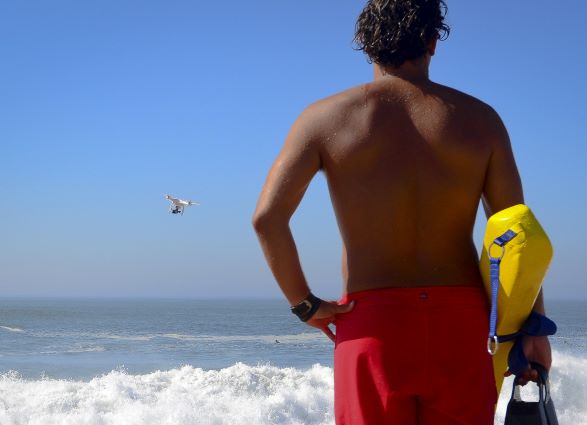 当地时间2014年8月27日,美国加州纽波特海滩,无人机正在监控海上的戏水者。