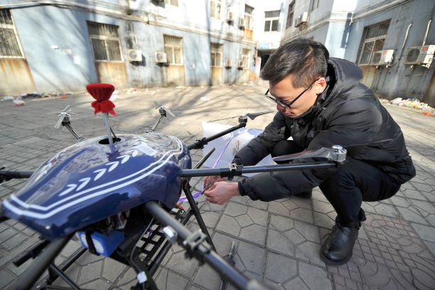 2014年12月16日,一青年男子驾驶豪车,带着几名伙伴来到河北廊坊大学城一栋女生宿舍楼下,用遥控器操纵一架无人机向一个窗口“空投”奢侈品进行求爱,但遭到该宿舍女生拒绝,同寝室女生用拖把和扫帚阻击“空投”,无人机差点被打下。图为男子将礼物系在无人机上准备空投。