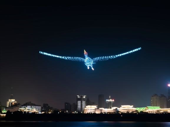 2019年12月5日,为庆祝“2019鄱阳湖国际观鸟周”开幕,江西南昌上千架无人机在赣江上空进行编队表演,白鹤惊艳亮相。