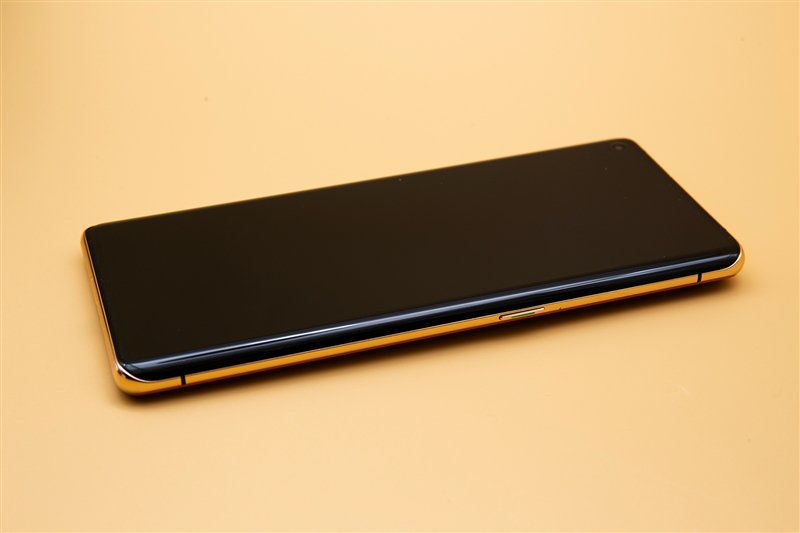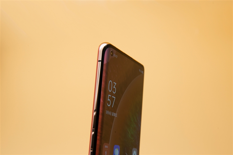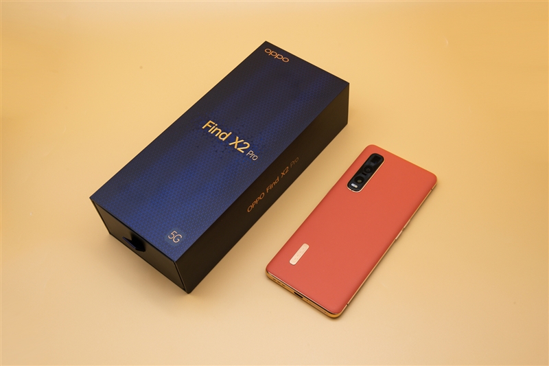 拿出OPPO Find X2 Pro本体,我们这次收到的是橘色的素皮版。可以看到双曲面的设计以及金色的边框。