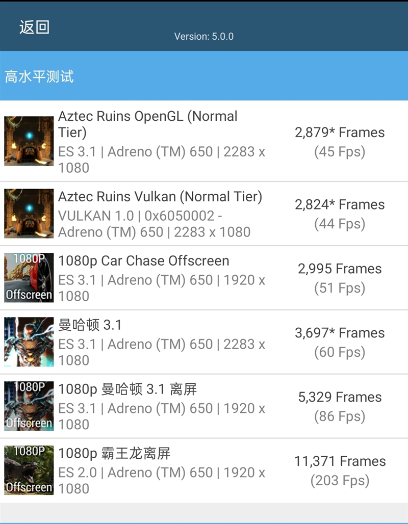 测试项目主要有6个:霸王龙(T-Rex)、曼哈顿3.0(Manhattan)、曼哈顿3.1(Manhattan)、赛车(Car Chase),分别对应OpenGL ES 2.0/3.0/3.1/3.1标准下的性能,另外还有新加入的阿兹特克废墟Vulkan离屏、阿兹特克废墟OpenGL离屏,测试压力越来越高,结果以平均帧率(FPS)衡量。