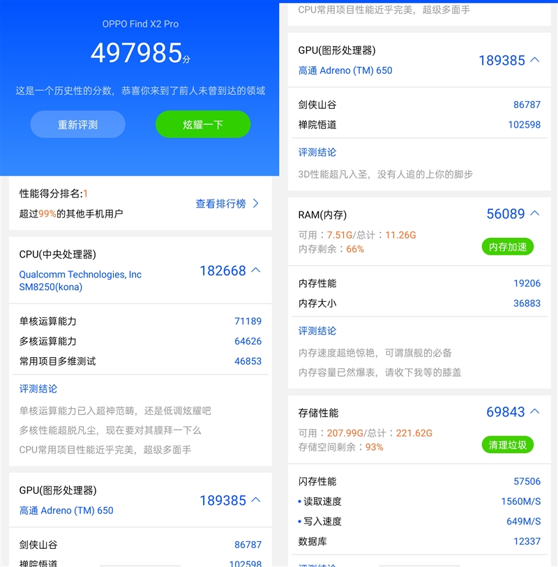 跑分测试的结果来看,性能表现符合骁龙865+LPDDR 5的正常水准,从AndroBench的结果可知,OPPO Find X2 Pro的UFS 3.0应该也有Write Turbo技术加持,读写速度都非常高。
