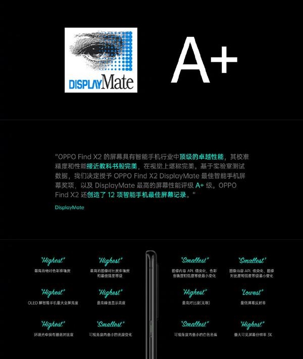 顶级屏幕有多强?先从一个公司讲起。DisplayMate,一家专注于屏幕色彩校正方案的公司,同时也开展有屏幕评测业务。而在对OPPO Find X2 Pro屏幕素质的评测中,他们称OPPO Find X2 Pro创下了12项手机最佳屏幕记录,其屏幕具有手机行业中顶级的卓越性能,为OPPO Find X2 Pro的屏幕给出了A+的评价。