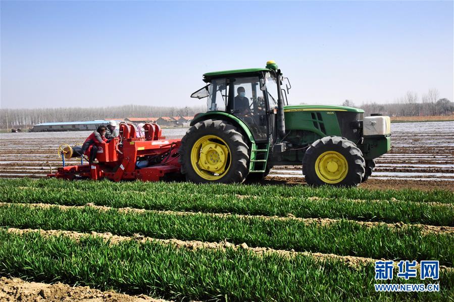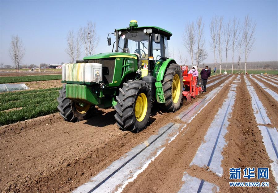 3月11日,在青岛平度市同和街道宋家赵戈庄村的农田里,青岛鸿运农机合作社的马铃薯播种机在作业。新华社记者 李紫恒 摄