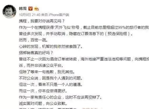 2017年10月9日,韩雪发文控诉携程,称被携程隐藏的捆绑消费被套路,投诉却换来一句“抱歉”,并奉劝大家“携程在手,看清楚再走!”