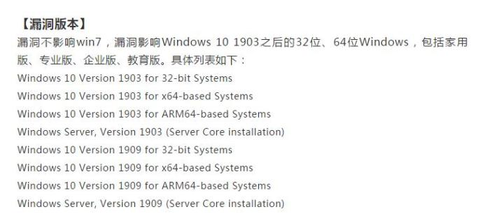 据介绍,漏洞不影响Windows 7,影响Windows 10 1903之后的各个32位、64位版Windows,包括家用版、专业版、企业版、教育版。这些正是目前主流操作系统版本,在个人、企业环境中应用广泛。