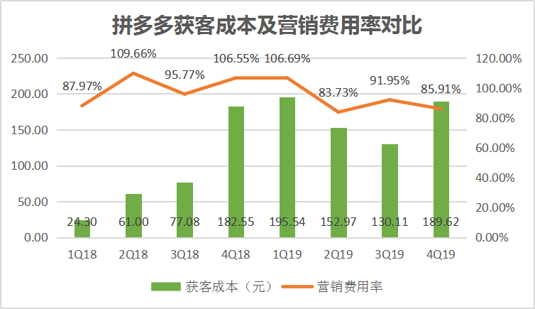 为了获得高端用户青睐,拼多多需要付出更高的获客成本。2019年平均每季度的获客成本为162.77亿元,接近2018年平均值的2倍,不过还是低于阿里和京东。