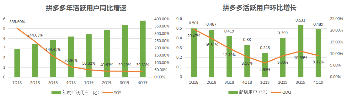 - 长期靠烧钱来换增长的拼多多,亏损在不断收窄。拼多多Q4经营亏损为21.35亿元,较2018年同期的26.4亿元、Q3的27.9亿元均有所收窄;净亏损为17.51亿,较2018年同期的——、Q3的——进一步缩小。