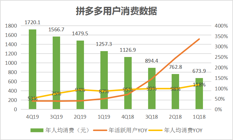反馈到数据上,拼多多近三个季度的年活用户基本稳定在40%的同比增速,年人均消费增长却逐渐下降为94%、75%及53%,稍显乏力。作为对比,京东2019年活跃用户人均消费(年GMV/年活跃用户)达到5760.77元,是拼多多的3.35倍,暗示了拼多多用户购买力仍显不足。