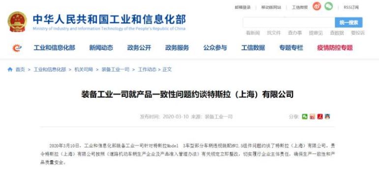 不管马斯克言论是否得当,3月10日,工业和信息化部装备工业司针对特斯拉Model3“减配”问题约谈了特斯拉(上海)有限公司,责令其按照《道路机动车辆生产企业及产品准入管理办法》有关规定立即整改,切实履行企业主体责任,确保生产一致性和产品质量安全。