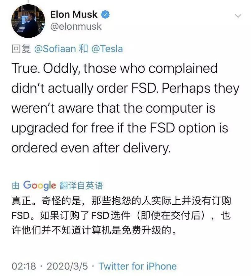 尽管店家安慰你:“亲,受疫情影响供应链,恢复后会立即为您更换,但现在不影响您使用。”但“柠檬精”马斯克表示,“很奇怪,那些抱怨的车主实际上并未选装FSD。或许是他们没有意识到即便买了车以后选装FSD,依然可以免费升级成自动驾驶硬件3.0。”彻底触碰了涉事车主的底线。