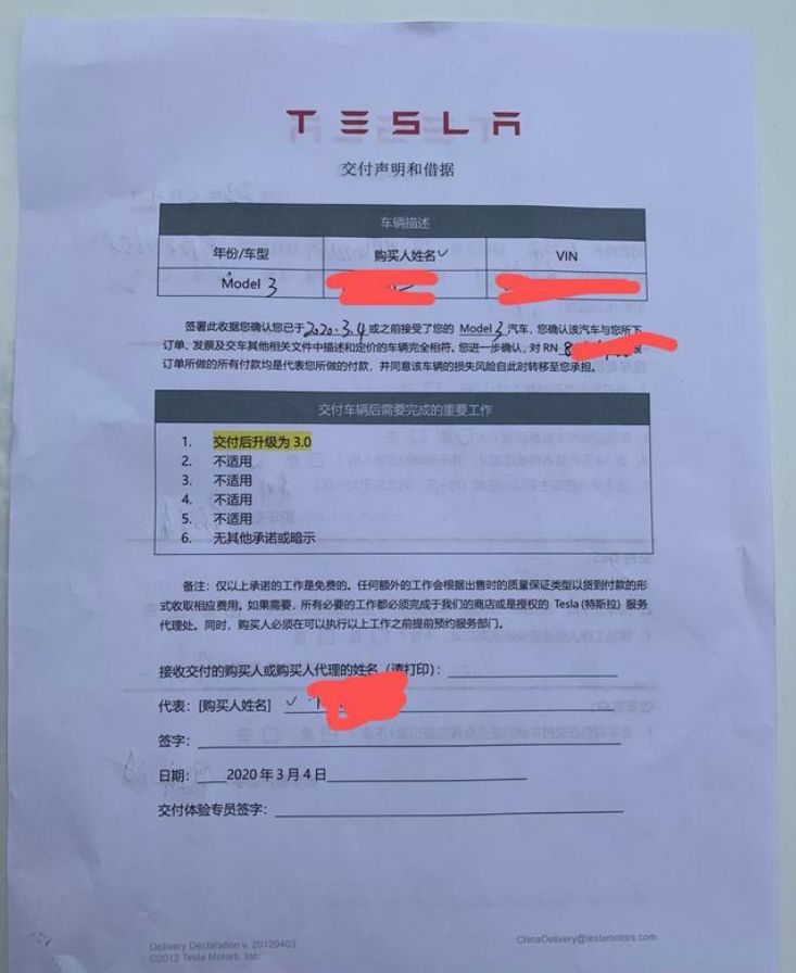 而特斯拉的动作显然也很快,根据最新迹象表明,特斯拉在此事上已经吸取教训,3月4日,有车主提供的“交付声明和借据”中,特斯拉已经注明“交付后升级为3.0”,是应该说特斯拉反映神速呢还是甩锅有章?