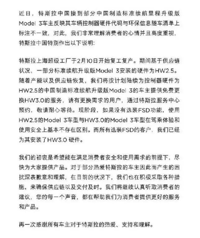 实际上,若是特斯拉出于保障客户用车,先行装配Hardware2.5硬件,并发出通知等回复生产之后,再为车主进行后期更换。或者直接发出声明,受疫情影响暂缓交车,都会得到车主的谅解。