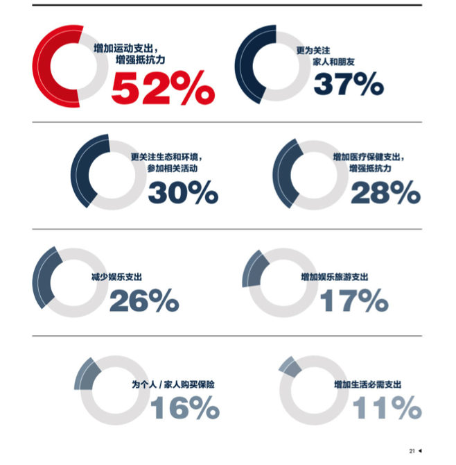 据悉,本次调研总计对全国480位企业家展开访问。受访企业家中超过半数计划 “增加运动支出”,同时约三成计划“增加医疗保健支出”。三成企业家表示更为“关注生态和环境”,16% 的企业家计划“为个人 / 家人购买保险”。