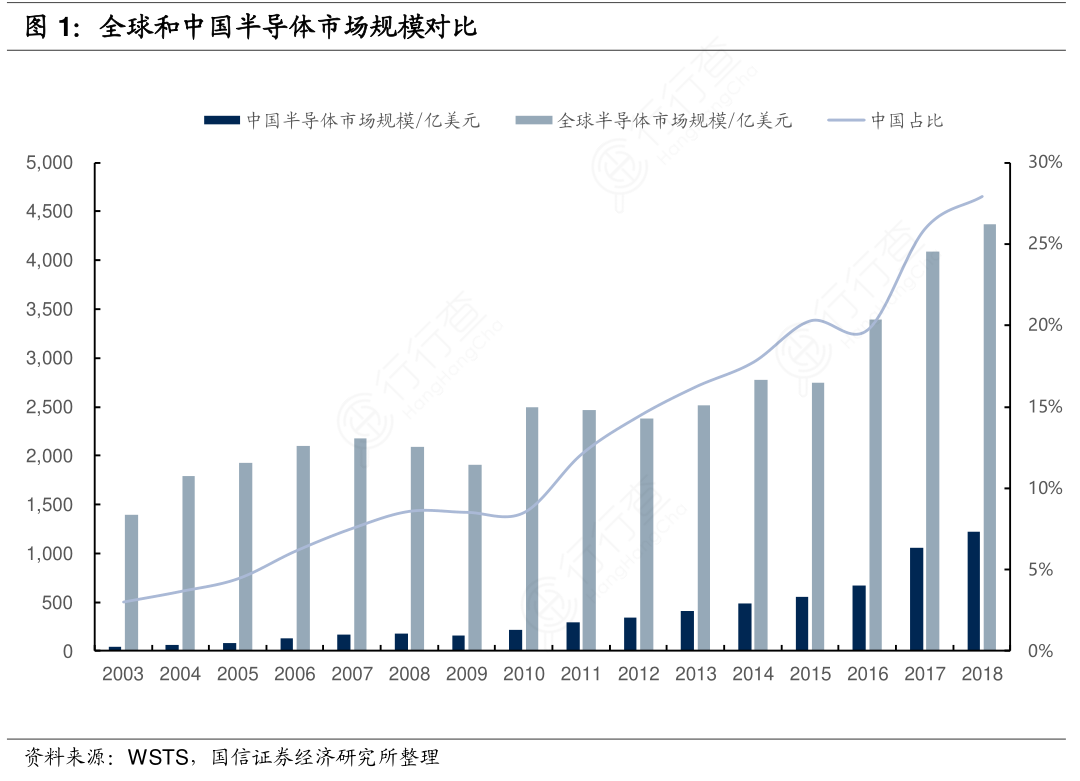伴随着我国经济的高速发展,智能手机和平板电脑市场呈爆发式增长,对各类集成电路产品需求不断增长,中国已经成为全球最大的半导体需求市场。2018年全球半导体市场规模约为4373亿美元,中国半导体市场规模约为1220亿美元,中国已经成为全球最大的半导体消费市场。