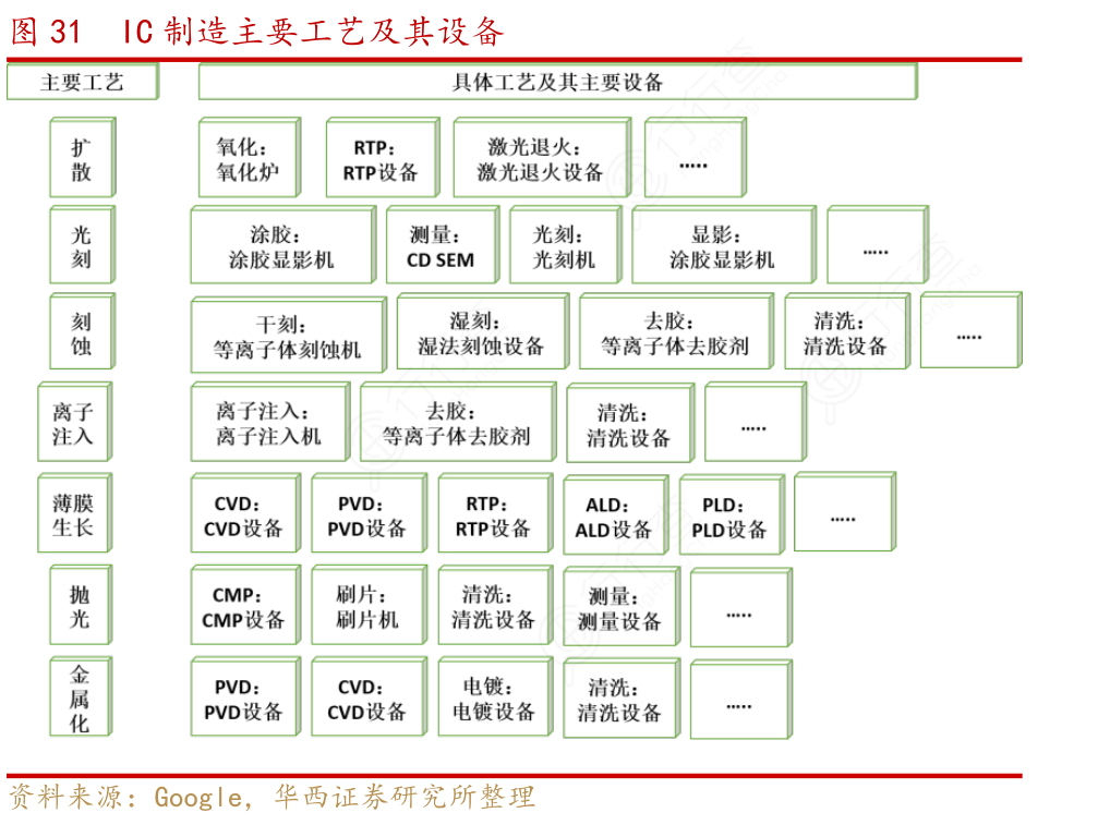 在IC制造过程中,主要工艺包括扩散(Thermal Process)、光刻(Photolithography)、刻蚀(Etch)、 离子注入(Ion Implant)、薄膜生长(Dielectric Deposition)、抛光(CMP)、金属化(Metallization)7个主要工艺。这些主要工艺又可细分为具体工艺,不同具体工艺都需要不同的半导体设备以满足IC制造中不同的需求。