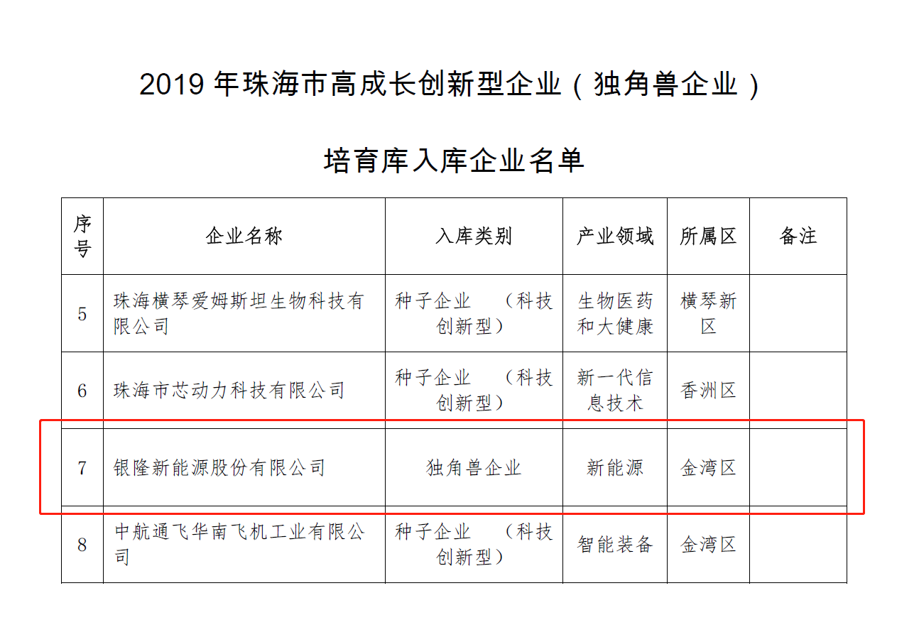 日前,“2019年珠海市高成长创新型企业(独角兽企业)培育库入库企业”名单正式公布,凭借行业具领先地位、自主创新能力强、企业成长性好,银隆新能源荣誉上榜,并成为2019年唯一一家独角兽企业 编辑