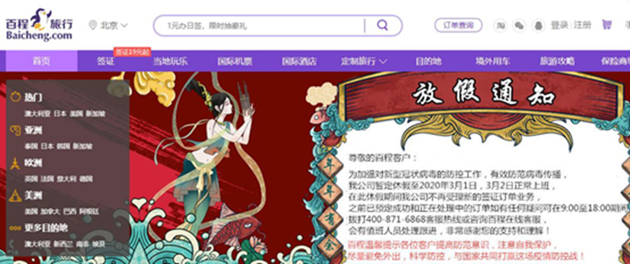 2月28日,旅游电商北京百程国际旅游股份有限公司(以下简称:百程旅行网)称因新冠肺炎疫情影响,公司无法运转,决定关闭并启动清算准备,成为首家在疫情冲击下倒闭的电商。