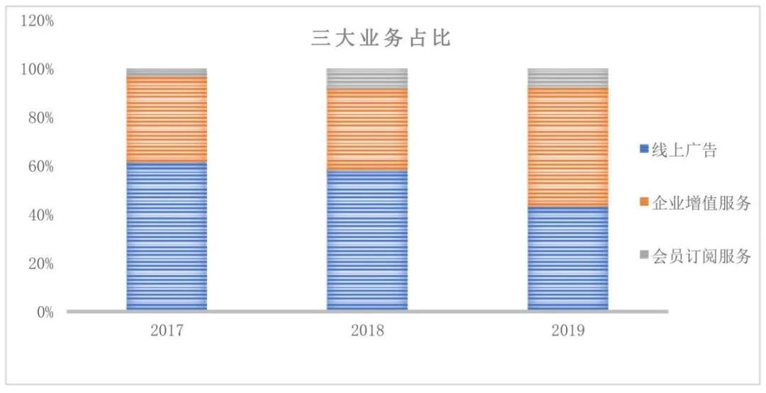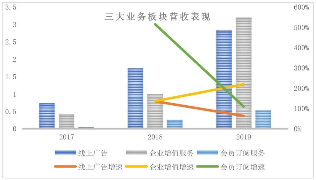 其中,增速最为抢眼的是企业增值服务,该板块2019年营收达3.2亿元人民币,同比增长219.4%,2018年增速为135%。占比最高的线上广告板块2019年营收为2.83亿元人民币,同比增长稍显逊色为62.8%,2018年增速为135%。占比最小的会员订阅服务板块2019年营收为5248万元人民币,同比增长109.1%,2018年增速为515.2%。
