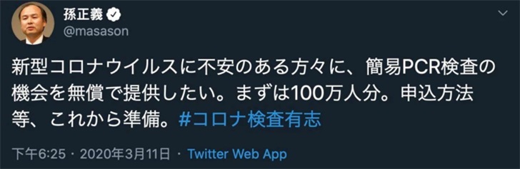 而恰逢当下日本疫情到了关键时期,近日孙正义在“断更”三年后,重新在社交网络发声,表示要向日本捐献100万份免费简易PCR病毒检测试剂。通过相关媒体的报道来看,PCR(聚合酶链式反应)是目前新冠病毒检测的主流方法,但是孙正义的这次善意之举却反而遭到了其本国人的反对。