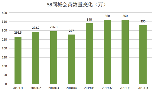 58同城的付费会员主要来自房地产及招聘行业,截至2019年12月31日,58同城、安居客等平台付费商户数约330万,比2018年同期微增4.2%,但是并没有带来收入的增加,说明单个会员贡献的收入减少了。