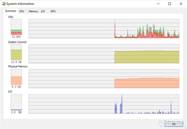 在主窗口顶部,可以简略显示CPU、内存等硬件的活动图表,如果点击它,就会有硬件的详细信息图表窗口了。