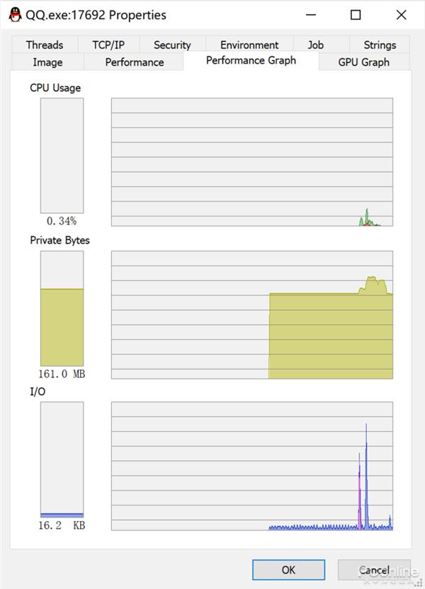 例如想要查看QQ到底是不是卡机的元凶,就可以查看QQ进程的详情页,Process Explorer能够在这个页面中显示QQ的CPU、内存、GPU等硬件资源的消耗记录。