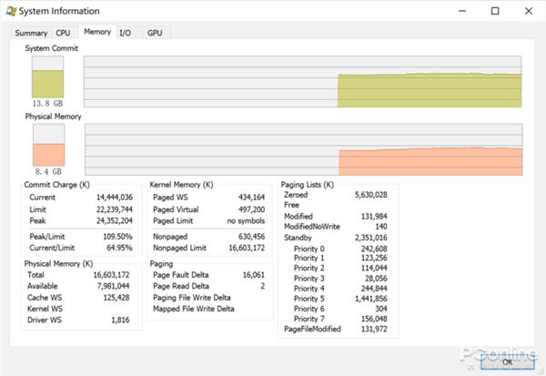 而和Win10任务管理器相比,Process Explorer还能够更精准地显示某些硬件详情,例如内存的界面中,可以显示物理内存占用,以及内存分页、系统提交峰值等等。