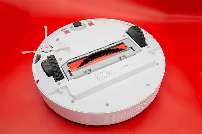 底部,可以看到两个主动轮和一个从动轮,都支持上下位置调整,最高可跨越2cm的障碍。单边刷负责扫出角落灰尘,主刷负责扫起地上的灰尘、毛发、碎屑等、