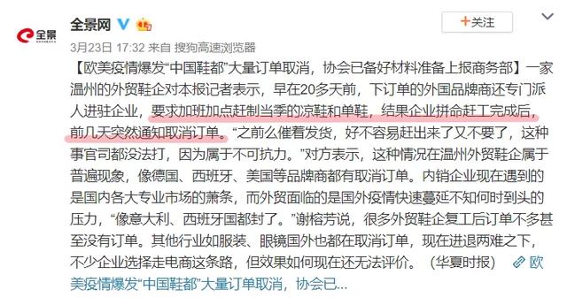 2 月的时候,被欧洲客户疯狂催赶工的鞋企,现在好不容易把货赶制出来,结果国外却把订单取消,连定金都不要了。