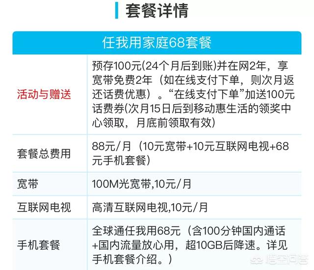 除却电信套餐之外,联通以及移动都会有类似的宽带业务。我们以移动为例,68元套餐(但是,每月88元,因为包括了10元宽带和10元互联网电视),10GB流量,100M的宽带,不划算。