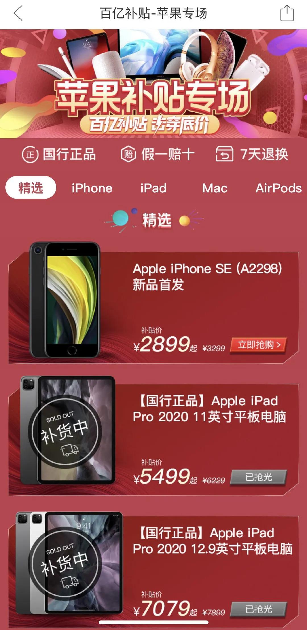 拼多多:号称百亿补贴-苹果专场,明确是国行正品、假一赔十、7天退换。苹果官方是3299起价,拼多多则是2899交个朋友的价格,补贴为400。当然,从已经给到的ipad的抢购来看,基本上都是秒光的。因此,想要买新款iPhone SE的,首先要早动手早参与,剩下的就是交给运气了。