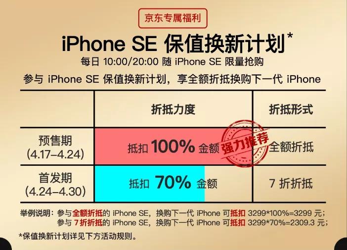 京东则推出了专属福利之iPhone SE保值换新计划,抵扣力度大到可以全额折抵(这个我很怀疑现实中有会发生)。同时还有以旧换新的方案,以旧换新的最高额为300。这一点,显然是不如拼多多交个朋友的力度。