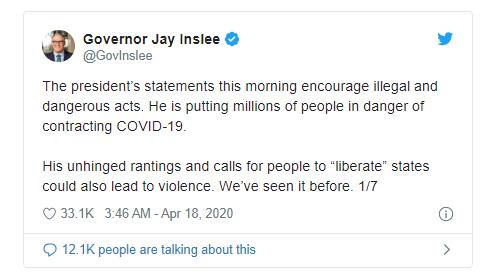 特朗普的推文引发了包括华盛顿州长杰伊·因斯利(Jay Inslee)在内的民主党政客的批评,他们说,总统的言论危及人们的健康。