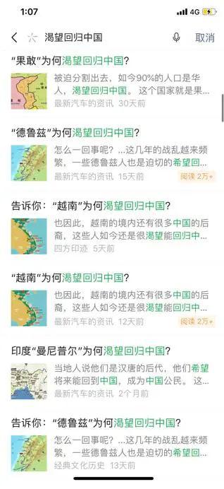日前,澎湃新闻记者以“渴望回归中国”为关键词在微信搜索发现,公众号 “最新汽车的资讯”发布近30篇以“某某国为何渴望回归中国”“某国为何从中国独立出去”为题的文章。该公众号注册公司为陕西省西安市曲江新区蜡笔网络工作室,于2019年1月7日注册公众账号“最新汽车的资讯”。