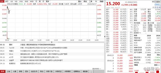 截止到目前,4月17日,中芯国际(0981.HK)股价为15.20港元,涨幅1.74%。