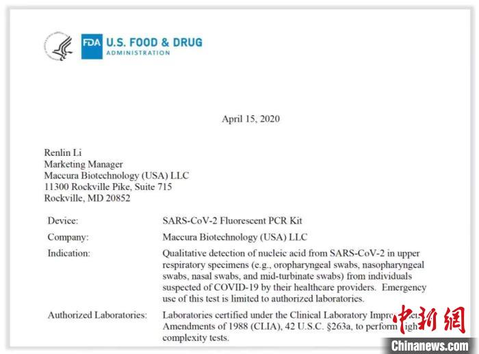 据了解,FDA于3月11日收到迈克生物新型冠状病毒2019-nCoV核酸检测试剂盒(荧光PCR法)的紧急使用预授权(Pre-EUA)申报并正式受理,3月24日完成了EUA的资料审核,4月15日正式签发授权。