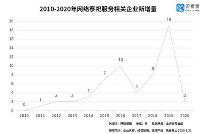 以祭祀来说,网络祭祀出现的时间并不短,但一直不温不火,与网络祭祀相关的企业,2011年开始每年新增量都有小幅度波动增加,直到2019年达到一个小高峰,新增相关企业19家,占所有企业总数的31.7%。