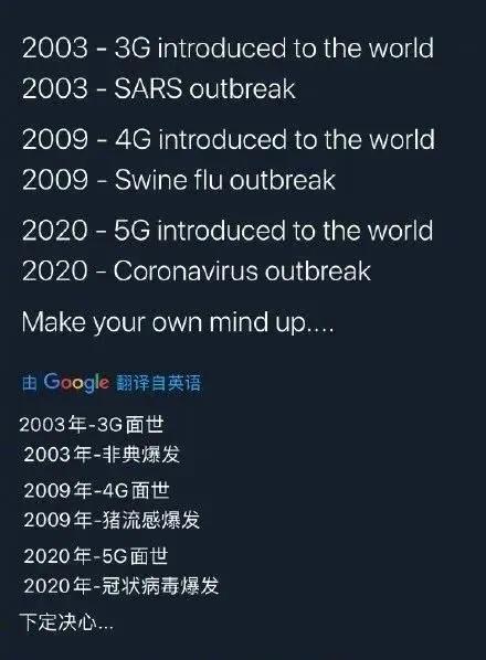 这名“砖家”还给出了“佐证”:2003年3G出现的时候,SARS爆发了;2009年4G来临后,(swine flu)猪流感发生了;2020年5G商用,新冠病毒爆发。“砖家”还说,武汉是全世界第一个5G商用的城市,所以首先爆发;非洲基本上没有新冠病毒,因为非洲没有建设5G。