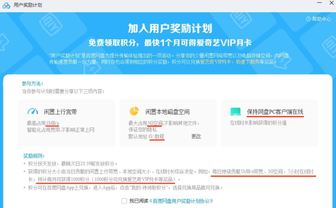 占用你 1MB/s 的上传带宽,占用本地 5G 硬盘空间,保持客户端长期在线,按天计算积分,积分可以用来兑换奖品。