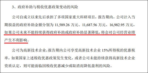 中微公司在招股书中表示,其自成立以来先后承担了多项国家重大科研项目,如果未来不能持续获得政府补助或政府补助显著降低,将会对其经营业绩产生不利影响。