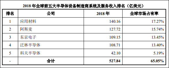 除此之外,根据美国调研机构VLSI Research统计,2018年全球半导体设备系统及服务销售额为811亿美元,其中前五大半导体设备制造厂商,由于起步较早,凭借资金、技术、客户资源、品牌等方面的优势,占据了全球半导体设备市场65%的市场份额。