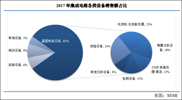 观察者网梳理发现,在集成电路产业中,制造设备主要包括晶圆制造设备、封装设备和测试设备等,其中晶圆制造设备的市场规模占比超过集成电路设备整体市场规模的80%。