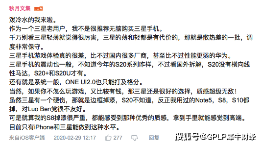 对于三星的表现,连不少老用户都心存怀疑:尽管质感无敌,但是存在“散热差”、“游戏体验感差”、“掉漆”、“系统一般”等问题。