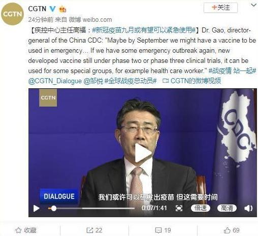 而据CGTN4月23日最新消息显示,中国疾控中心主任高福日前在接受CGTN采访时表示:或许九月份中国就有一种可以在紧急情况下使用的疫苗,到明年初就能研发出可以用于健康人群的疫苗。