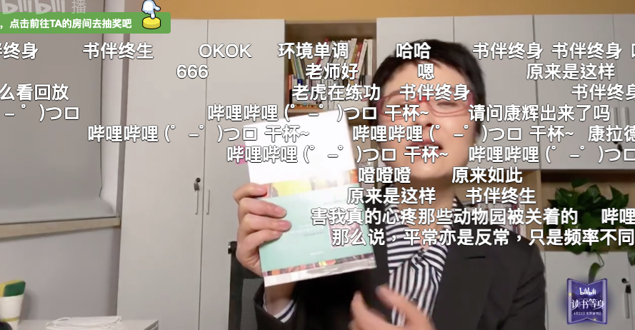 B站的读书直播则回归到书籍内容本身。比如周星驰御用配音,60后的石斑瑜深情并茂的朗诵《匆匆》里面的片段,弹幕里出现“有内味了”、”想哭“、“泪目”等,纪连海读着《红楼梦》中“黛玉进贾府”经典片段,在弹幕上体现出“童年回忆”共鸣,张泉灵在耐心解释书中的道理时,弹幕上则有“原来是这样”、“思维一变、出路一片”的相关反馈。