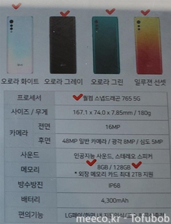 据爆料称,这款LG Velvet搭载了高通骁龙765G移动平台,拥有8GB内存+128GB存储的组合;搭载了前置1600万像素,后置4800万主摄+800万超广角+500万三摄的组合;电池容量为4300mAh,支持IP68级防尘防水。