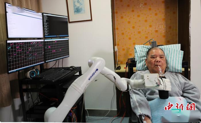 相比于Battelle于2016年发表的科研成果,如图所示,浙大的实验使用了机械臂,更好的让患者进食。